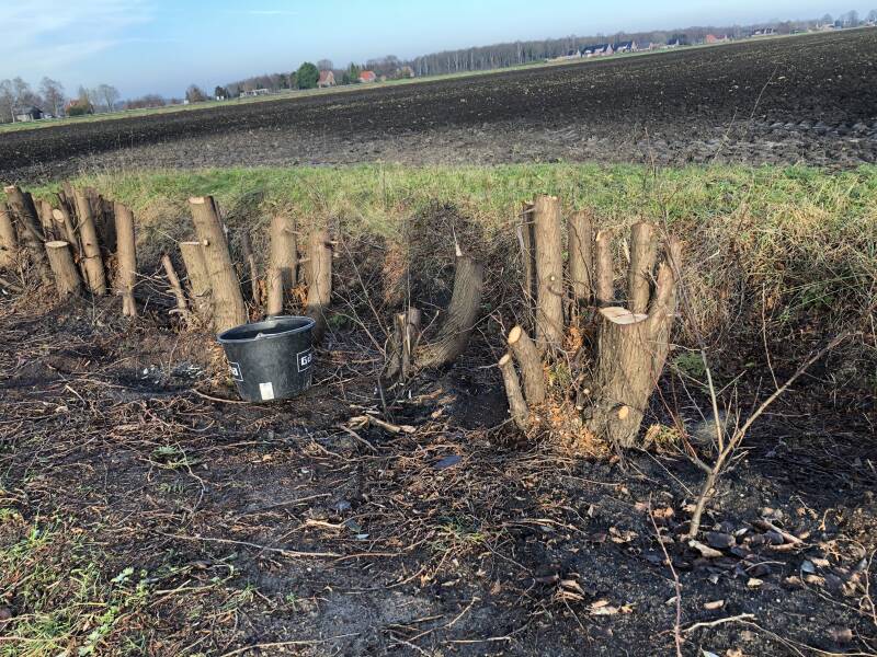 Als je goed kijkt zie je links van de emmer twee stuks Ruby staan en rechts van de emmer de andere twee. De rechter twee zijn al een week of 2-3 geleden aangeplant. Omdat Haag Achter aangepast is (lees Aanplant - deel 1) zijn de linker twee op 13 december geplant.